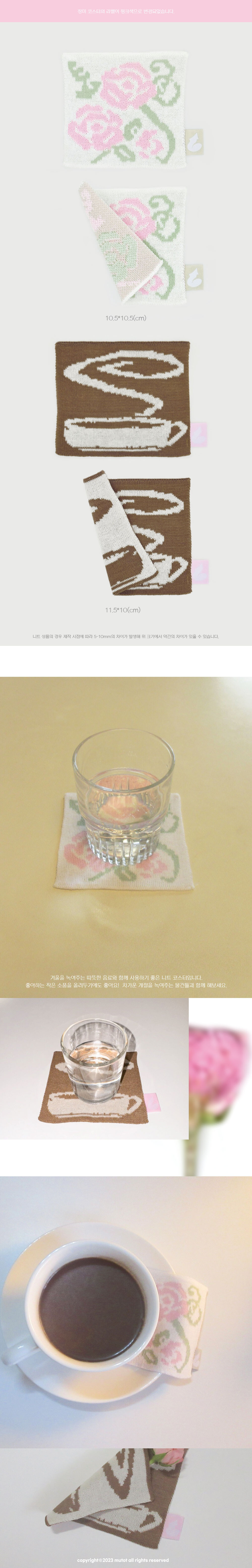 차가운 겨울을 녹여주는 따뜻한 음료와 함께 사용하기 좋은 니트 코스터입니다. 좋아하는 작은 소품을 올려두기에도 좋아요! 차가운 계절을 녹여주는 물건들과 함께 해보세요.