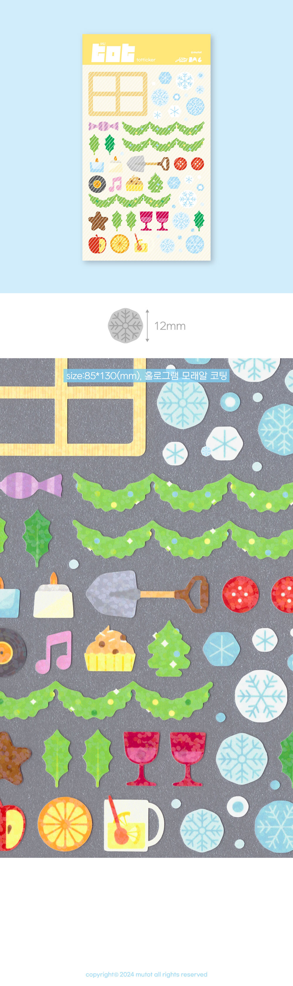 흰 눈이 오는 날 창밖을 바라보며 즐기는 따뜻한 음료와 음악들 흰 눈과 함께하는 하루를 담은 스티커입니다. 반짝이는 모래알 코팅의 은은한 빛이 매력적인 스티커입니다. (1매)