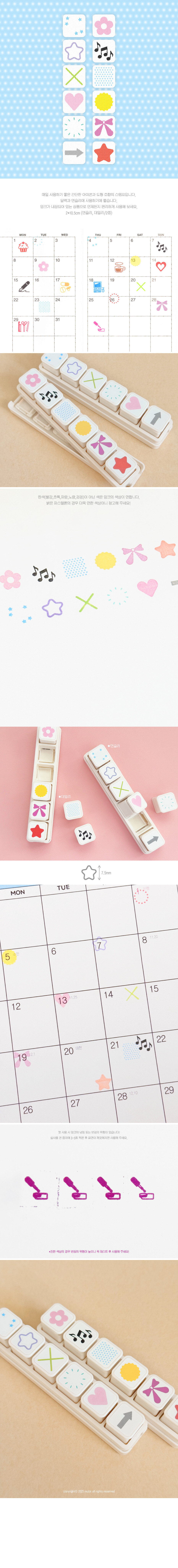 매일 사용하기 좋은 간단한 아이콘과 도형 조합의 스탬프입니다. 달력과 먼슬리에 사용하기에 좋습니다. 잉크가 내장되어 있는 상품으로 언제든지 편리하게 사용해 보세요.